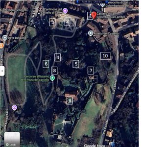 1. Torre di ingresso (Torre nord) (Fig. 1): Rappresenta l'ingresso principale al complesso. Sono ancora visibili lo stemma dei Visconti e gli incassi in cui si inserivano le travi per il sollevamento del ponte levatoio. A fianco del ponte principale, destinato ai carri, vi era una ponticella per le persone. Originariamente era presente, nell'attuale piazza, ad ulteriore protezione, un rivellino. 2. Corte: L'edificio a due piani che oggi domina la corte risale al diciannovesimo secolo e venne realizzato dai Belgioioso. L'interno è in larga parte in stile neogotico ed è visitabile. 3. Torre di ingresso ovest: Ha struttura simile alla torre nord. Lo stemma visconteo venne qui sostituito con quello dell'ordine certosino. A partire dal periodo certosino assunse anche funzione abitativa. 4. Parco: Quello che resta del parco all'inglese realizzato dai Belgioioso nel diciannovesimo secolo. 5. Pozzo: Uno dei pozzi che servivano l'antico ricetto. 6. Mura ovest: Seguono l'andamento collinare e presentano una base a scarpa e una merlatura ghibellina. Sono scandite da torri quadrate aperte verso l'interno del complesso. 7. Torre Mirabello (o Petrarca): E' dedicata alla memoria di Francesco Petrarca, che dimorò nel castello, ospite dei Visconti, nell'Ottobre del 1353. 8. Torre Sporta (o di Bona di Savoia): Grazie alla sua posizione, rafforzava la difesa del lato ovest del castello. 9. Rocca: Oggi di proprietà privata. E' la parte del complesso che per lungo tempo ha avuto una funzione squisitamente militare. 10. Mura est: Presentano un camminamento di ronda sostenuto da volte che sono state successivamente inglobate negli edifici del ricetto.