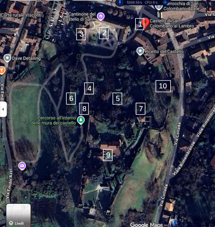 STRUTTURA Il complesso del castello è troppo amplio e articolato per descrivere tutto in dettaglio. Per questo si rimanda al volumetto Il Castello di San Colombano al Lambro acquistabile in loco. Qui ci si limiterà ad un elenco per punti delle parti principali e ad una descrizione delle sale interne più significative.